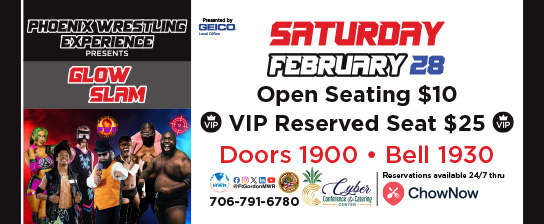 Grab your friends and gear up for a night of unforgettable wrestling action! The Phoenix Wrestling Experience returns to Fort Gordon for Glow Slam presented by your Local Geico Office.