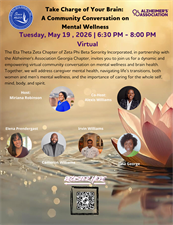 The Eta Theta Zeta Chapter of Zeta Phi Beta Sorority Incorporated, in partnership with the Alzheimer's Association Georgia Chapter, invites you to join us for a dynamic and empowering virtual community conversation on mental wellness and brain health. Together, we will address caregiver mental health, navigating life’s transitions, both women and men’s mental wellness, and the importance of caring for the whole self, mind, body, and spirit.